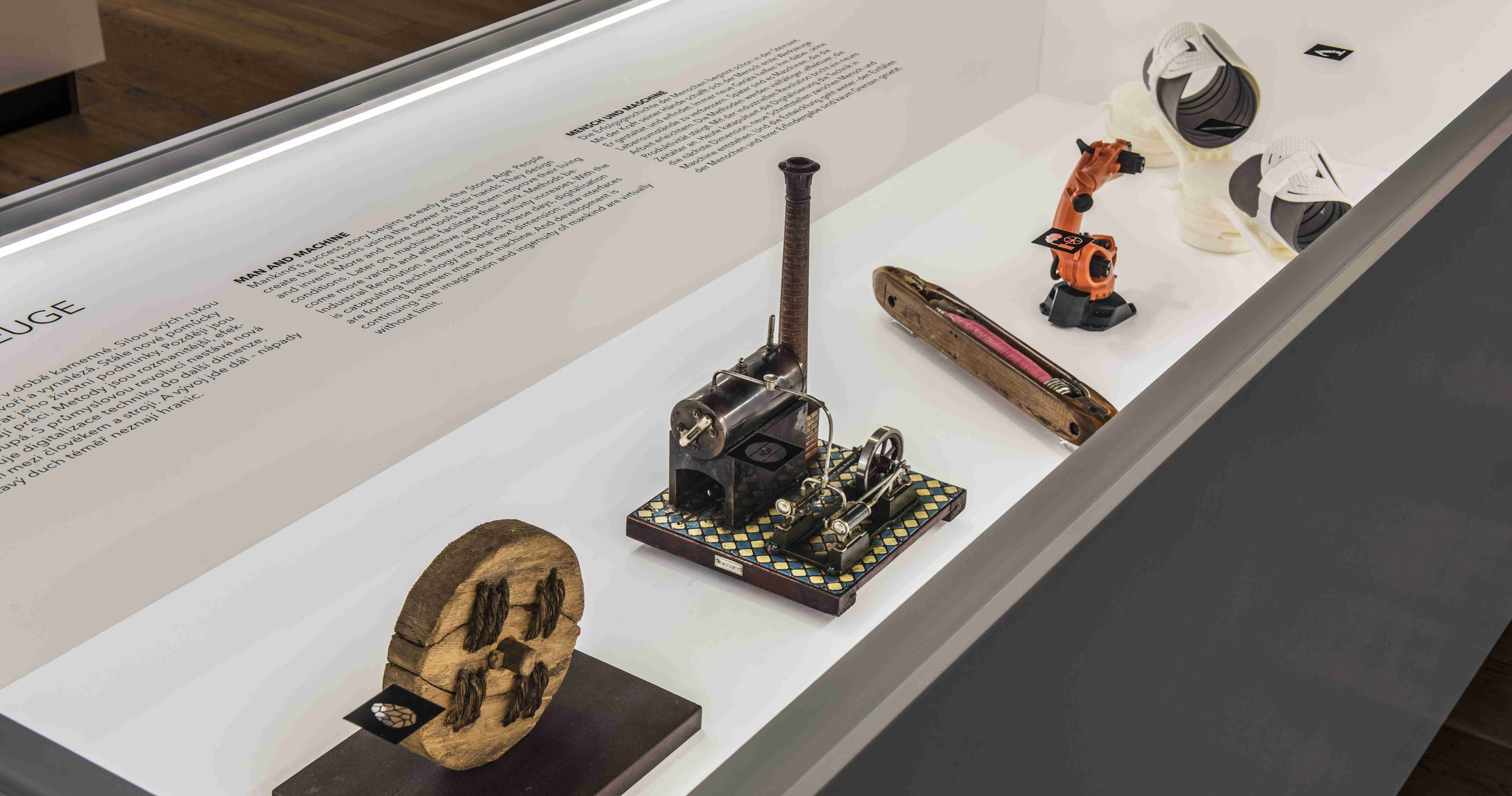 Prosvětlené vitríny prezentují historické milníky konstrukčního a inženýrského umění, od prvních nástrojů až po vynálezy, které se uplatní v blízké budoucnosti. Zvláštní pozornost je věnována regionu Čech a bohaté tradici, kterou v oblasti technického vývoje máme.